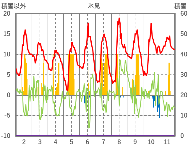 | 日 | 時 | 気温 | 降水 | 風向/風速 | 日照 | 積雪 | 降雪 |
