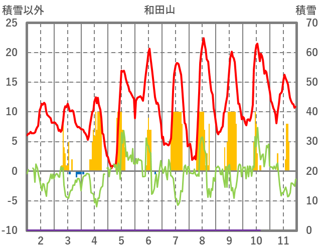 | 日 | 時 | 気温 | 降水 | 風向/風速 | 日照 | 積雪 | 降雪 |