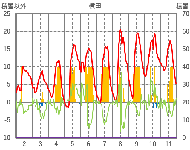 | 日 | 時 | 気温 | 降水 | 風向/風速 | 日照 | 積雪 | 降雪 |