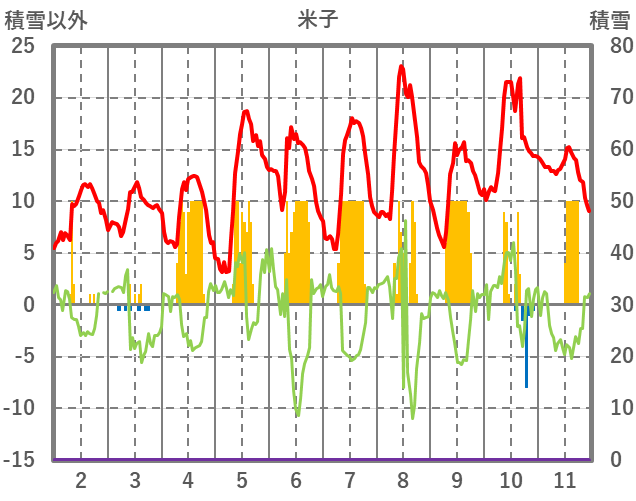 | 日 | 時 | 気温 | 降水 | 風向/風速 | 日照 | 積雪 | 降雪 |