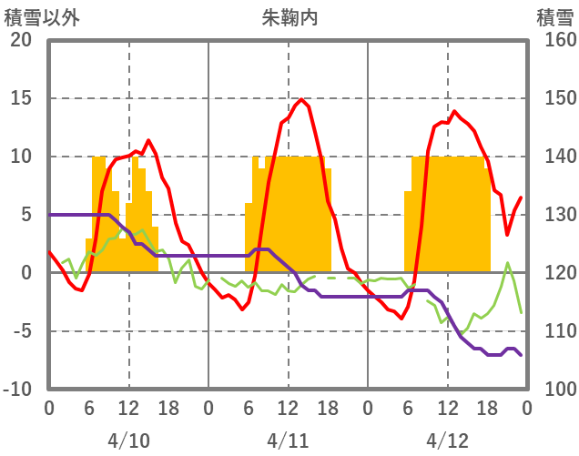 | 日 | 時 | 気温 | 降水 | 風向/風速 | 日照 | 積雪 | 降雪 |