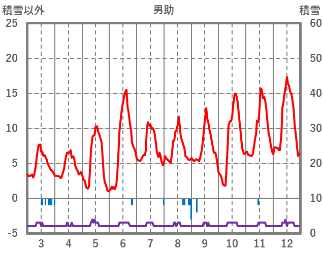 | 日 | 時 | 気温 | 降水 | 風向/風速 | 日照 | 積雪 | 降雪 |