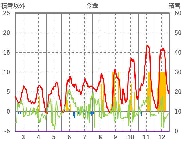 | 日 | 時 | 気温 | 降水 | 風向/風速 | 日照 | 積雪 | 降雪 |