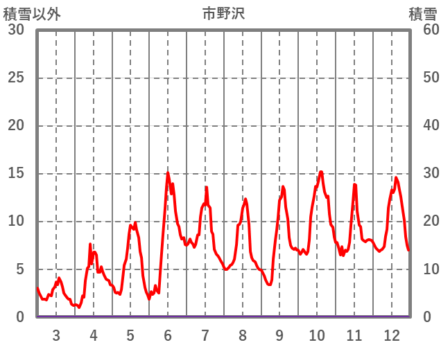 | 日 | 時 | 気温 | 降水 | 風向/風速 | 日照 | 積雪 | 降雪 |
