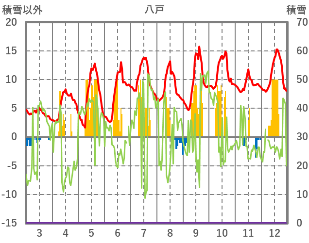 | 日 | 時 | 気温 | 降水 | 風向/風速 | 日照 | 積雪 | 降雪 |