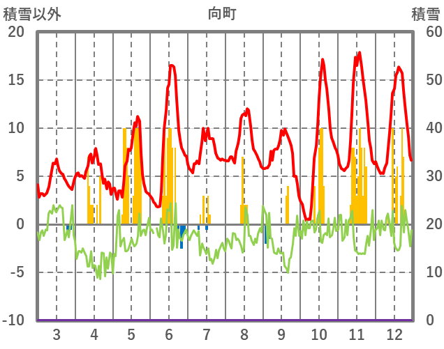 | 日 | 時 | 気温 | 降水 | 風向/風速 | 日照 | 積雪 | 降雪 |