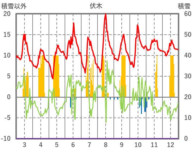 | 日 | 時 | 気温 | 降水 | 風向/風速 | 日照 | 積雪 | 降雪 |