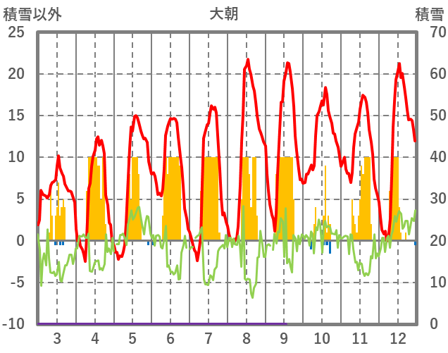 | 日 | 時 | 気温 | 降水 | 風向/風速 | 日照 | 積雪 | 降雪 |
