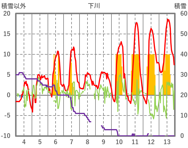 | 日 | 時 | 気温 | 降水 | 風向/風速 | 日照 | 積雪 | 降雪 |