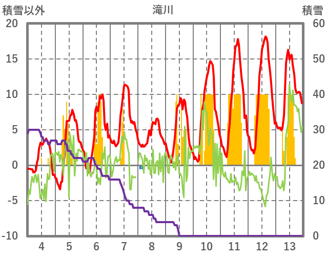 | 日 | 時 | 気温 | 降水 | 風向/風速 | 日照 | 積雪 | 降雪 |