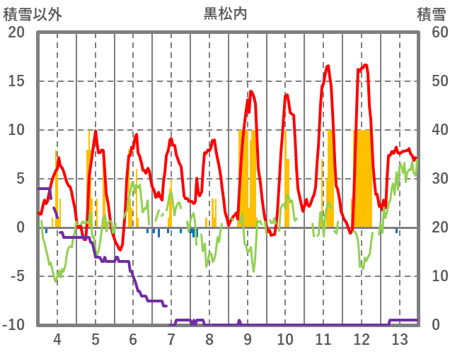 | 日 | 時 | 気温 | 降水 | 風向/風速 | 日照 | 積雪 | 降雪 |