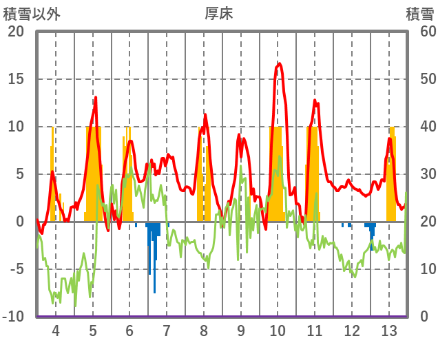 | 日 | 時 | 気温 | 降水 | 風向/風速 | 日照 | 積雪 | 降雪 |