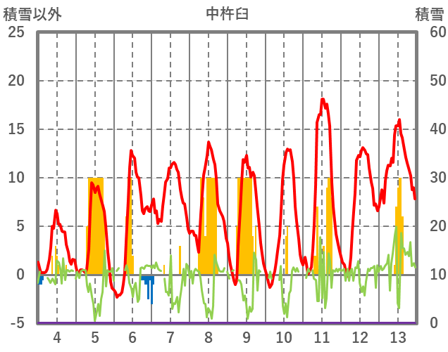 | 日 | 時 | 気温 | 降水 | 風向/風速 | 日照 | 積雪 | 降雪 |