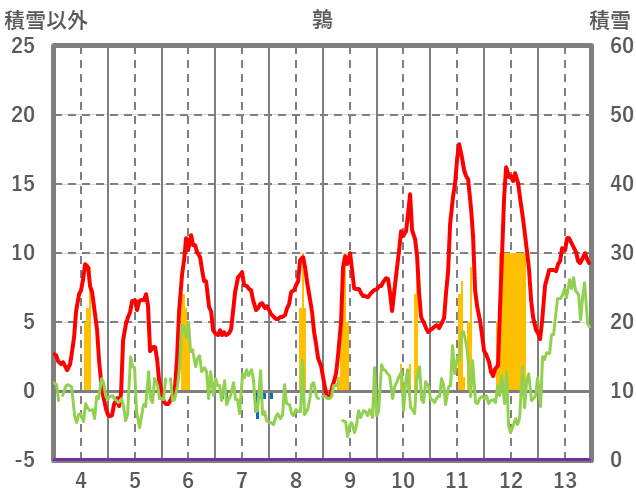 | 日 | 時 | 気温 | 降水 | 風向/風速 | 日照 | 積雪 | 降雪 |