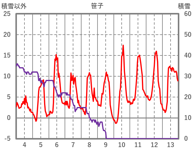| 日 | 時 | 気温 | 降水 | 風向/風速 | 日照 | 積雪 | 降雪 |