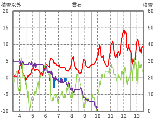 | 日 | 時 | 気温 | 降水 | 風向/風速 | 日照 | 積雪 | 降雪 |