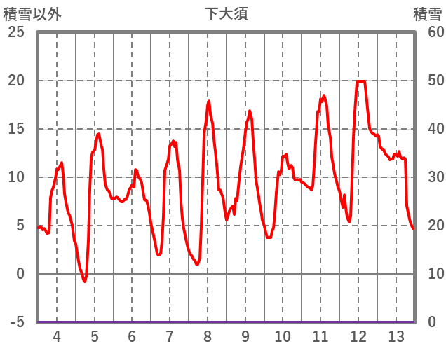 | 日 | 時 | 気温 | 降水 | 風向/風速 | 日照 | 積雪 | 降雪 |
