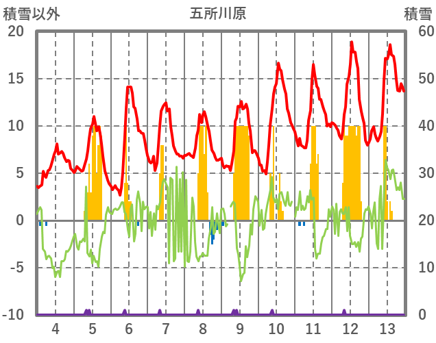 | 日 | 時 | 気温 | 降水 | 風向/風速 | 日照 | 積雪 | 降雪 |