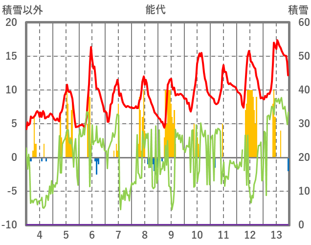 | 日 | 時 | 気温 | 降水 | 風向/風速 | 日照 | 積雪 | 降雪 |