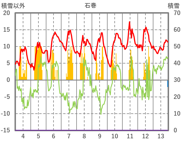 | 日 | 時 | 気温 | 降水 | 風向/風速 | 日照 | 積雪 | 降雪 |