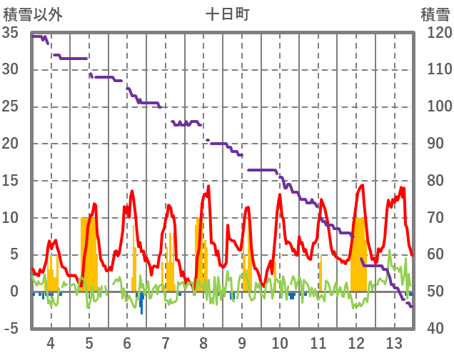 | 日 | 時 | 気温 | 降水 | 風向/風速 | 日照 | 積雪 | 降雪 |