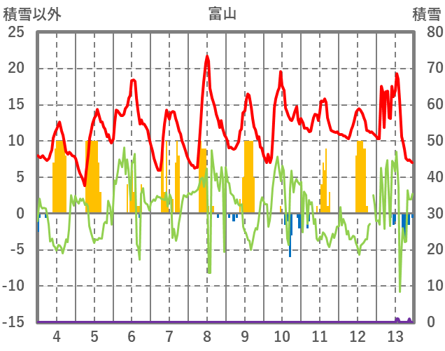 | 日 | 時 | 気温 | 降水 | 風向/風速 | 日照 | 積雪 | 降雪 |