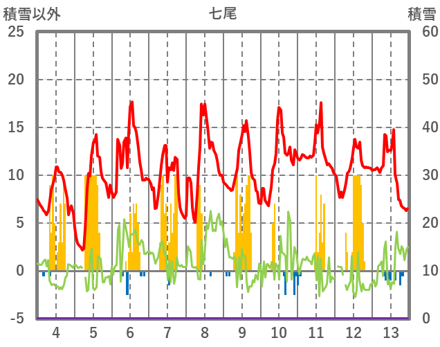 | 日 | 時 | 気温 | 降水 | 風向/風速 | 日照 | 積雪 | 降雪 |