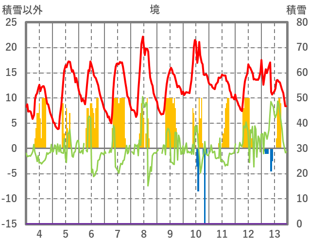 | 日 | 時 | 気温 | 降水 | 風向/風速 | 日照 | 積雪 | 降雪 |