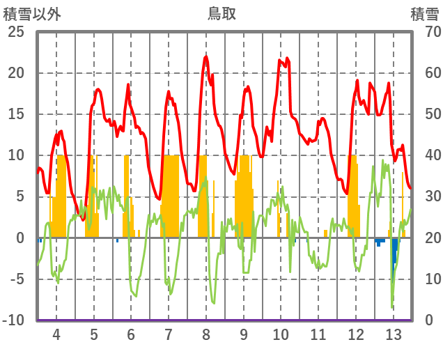 | 日 | 時 | 気温 | 降水 | 風向/風速 | 日照 | 積雪 | 降雪 |