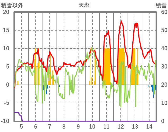 | 日 | 時 | 気温 | 降水 | 風向/風速 | 日照 | 積雪 | 降雪 |