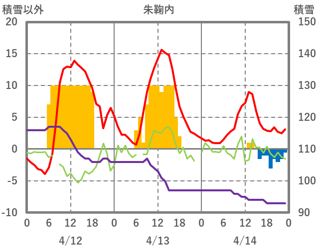 | 日 | 時 | 気温 | 降水 | 風向/風速 | 日照 | 積雪 | 降雪 |