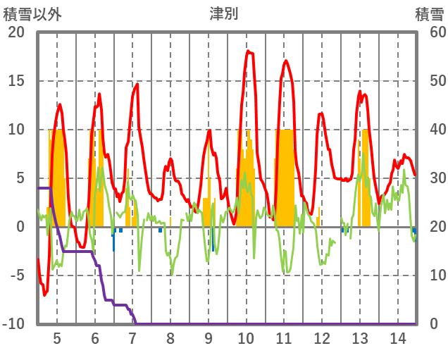 | 日 | 時 | 気温 | 降水 | 風向/風速 | 日照 | 積雪 | 降雪 |