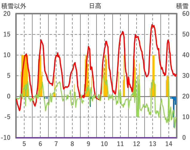 | 日 | 時 | 気温 | 降水 | 風向/風速 | 日照 | 積雪 | 降雪 |