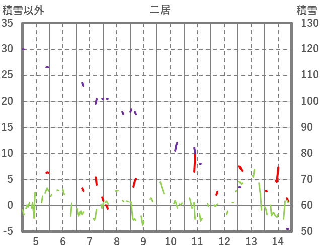 | 日 | 時 | 気温 | 降水 | 風向/風速 | 日照 | 積雪 | 降雪 |