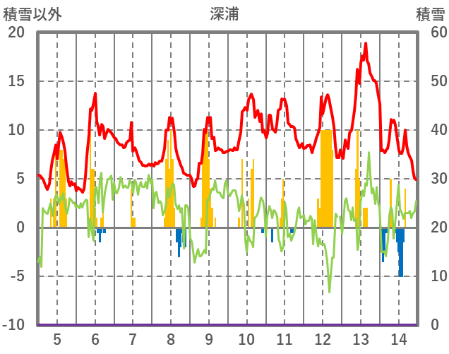 | 日 | 時 | 気温 | 降水 | 風向/風速 | 日照 | 積雪 | 降雪 |