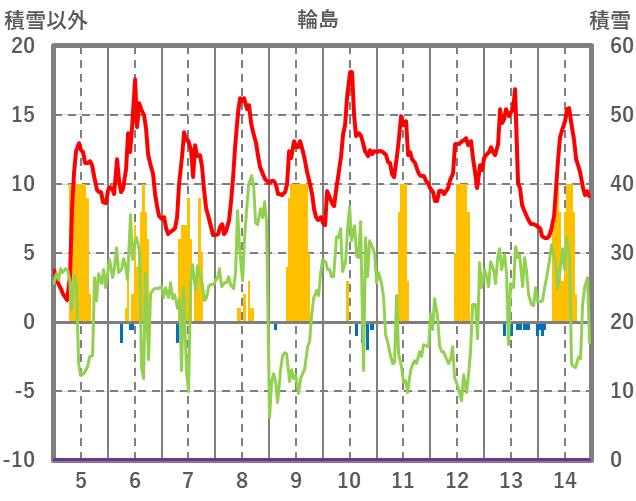 | 日 | 時 | 気温 | 降水 | 風向/風速 | 日照 | 積雪 | 降雪 |
