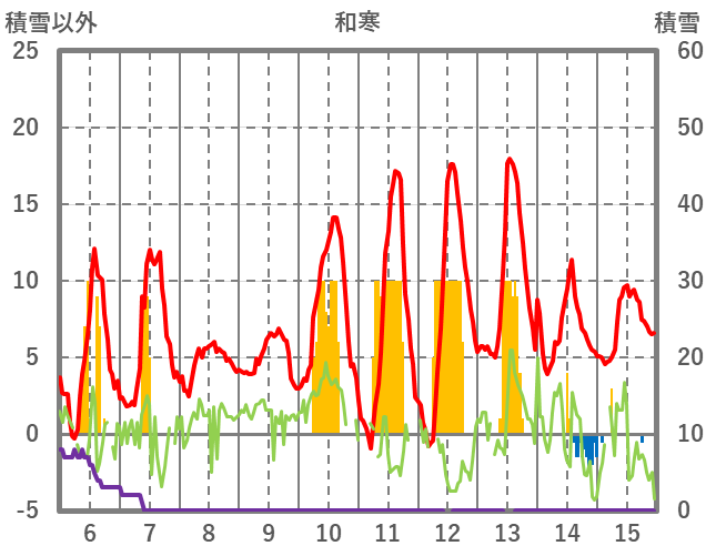 | 日 | 時 | 気温 | 降水 | 風向/風速 | 日照 | 積雪 | 降雪 |