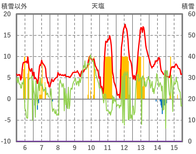 | 日 | 時 | 気温 | 降水 | 風向/風速 | 日照 | 積雪 | 降雪 |