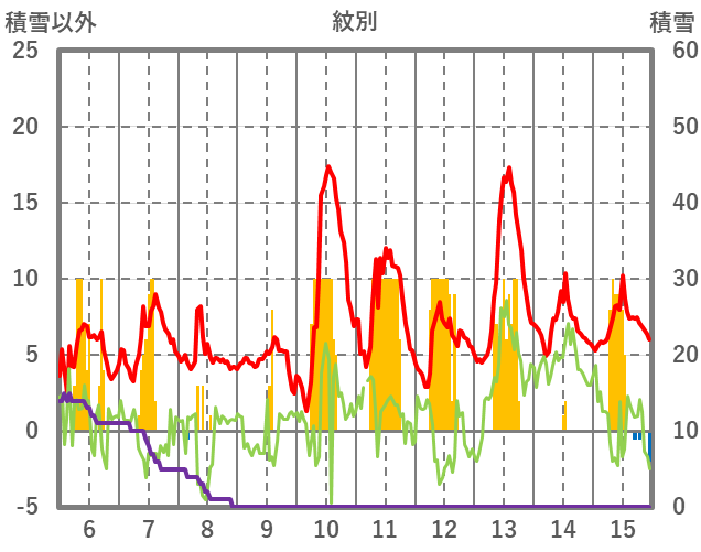 | 日 | 時 | 気温 | 降水 | 風向/風速 | 日照 | 積雪 | 降雪 |
