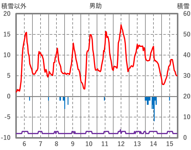 | 日 | 時 | 気温 | 降水 | 風向/風速 | 日照 | 積雪 | 降雪 |