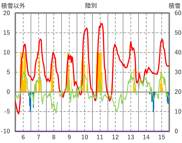 | 日 | 時 | 気温 | 降水 | 風向/風速 | 日照 | 積雪 | 降雪 |