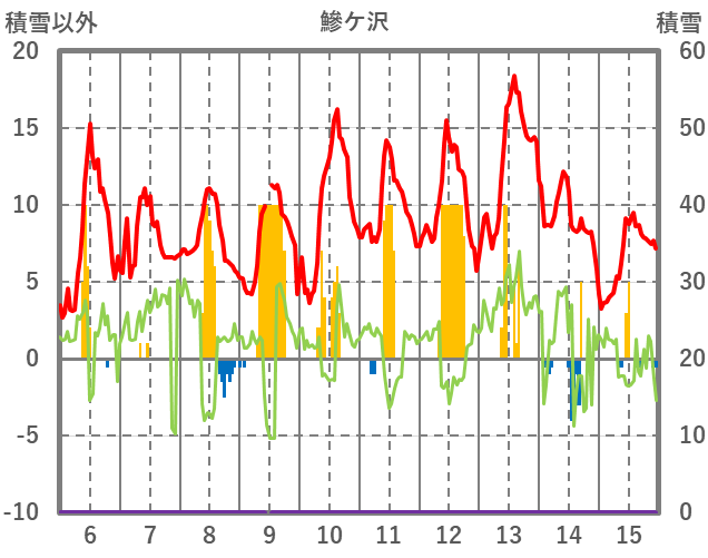 | 日 | 時 | 気温 | 降水 | 風向/風速 | 日照 | 積雪 | 降雪 |