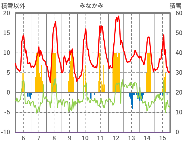 | 日 | 時 | 気温 | 降水 | 風向/風速 | 日照 | 積雪 | 降雪 |