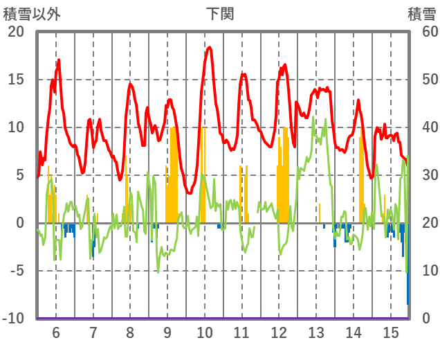 | 日 | 時 | 気温 | 降水 | 風向/風速 | 日照 | 積雪 | 降雪 |