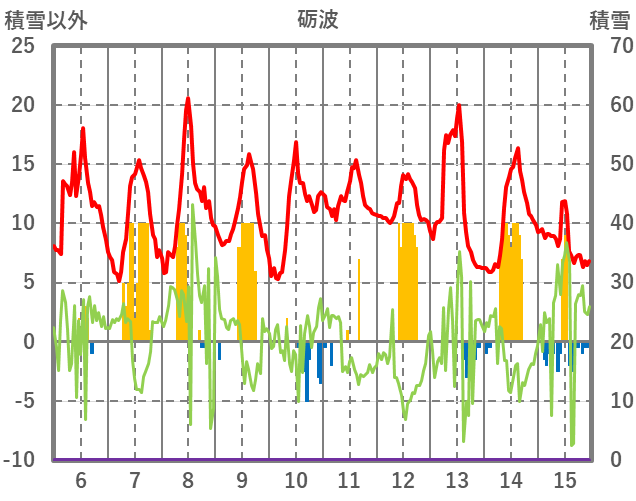 | 日 | 時 | 気温 | 降水 | 風向/風速 | 日照 | 積雪 | 降雪 |