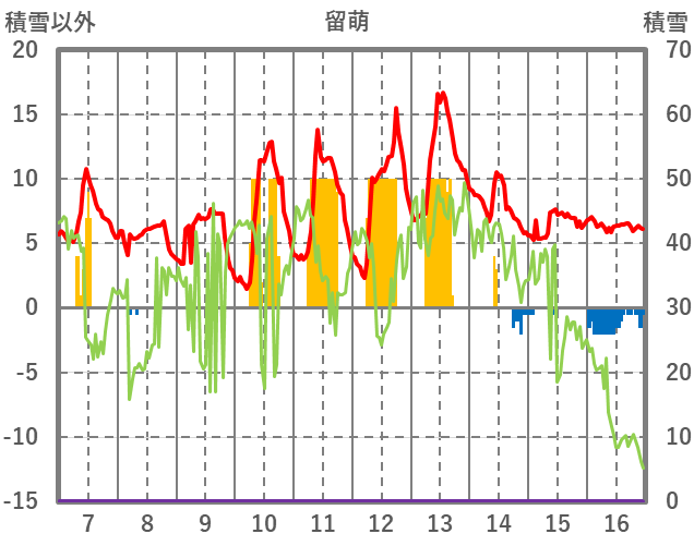 | 日 | 時 | 気温 | 降水 | 風向/風速 | 日照 | 積雪 | 降雪 |