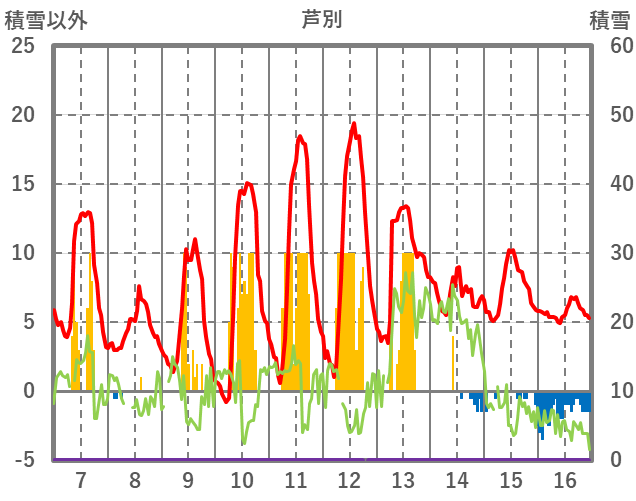 | 日 | 時 | 気温 | 降水 | 風向/風速 | 日照 | 積雪 | 降雪 |