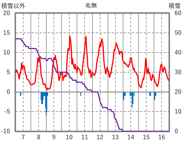 | 日 | 時 | 気温 | 降水 | 風向/風速 | 日照 | 積雪 | 降雪 |