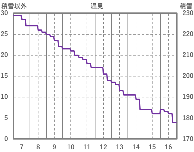 | 日 | 時 | 気温 | 降水 | 風向/風速 | 日照 | 積雪 | 降雪 |