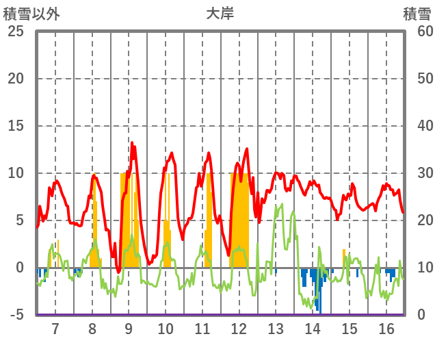 | 日 | 時 | 気温 | 降水 | 風向/風速 | 日照 | 積雪 | 降雪 |